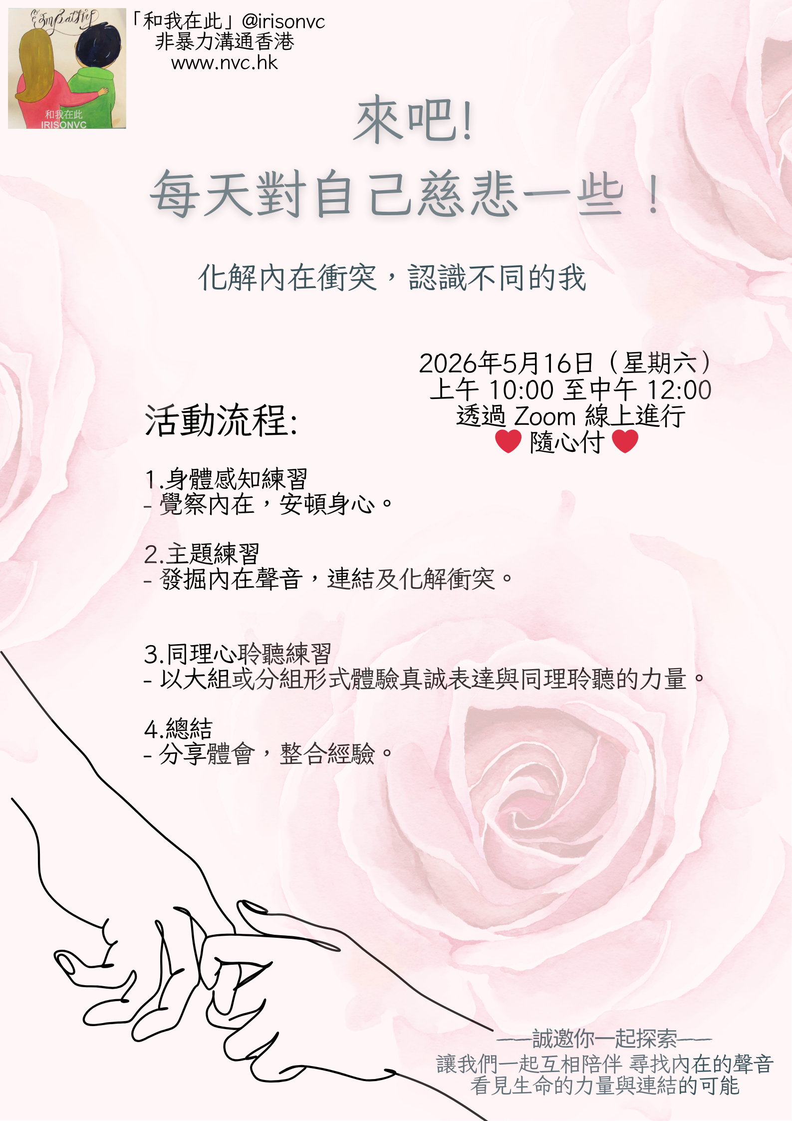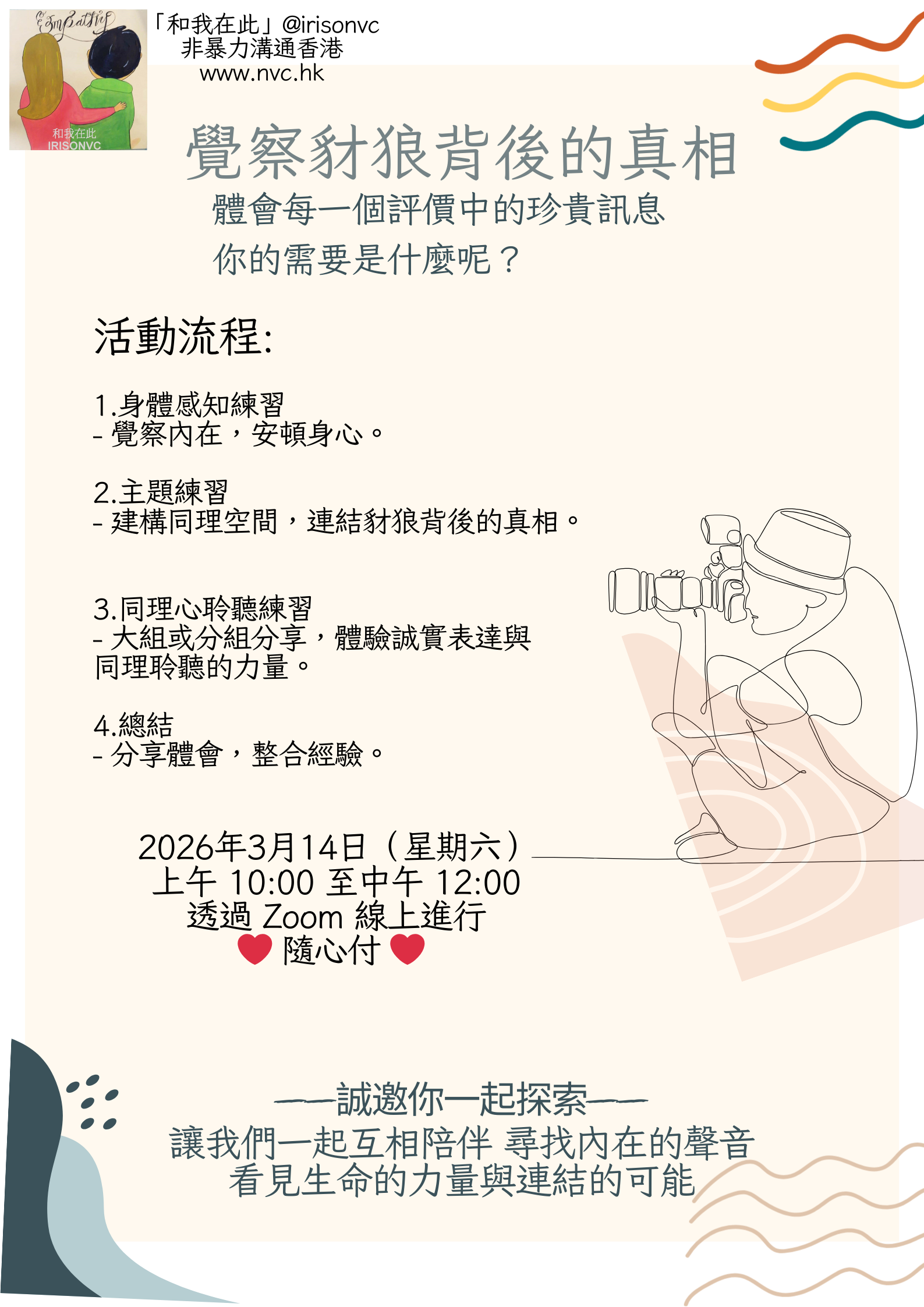 誠邀你一起探索——讓我們一起互相陪伴,尋找內在的聲音,看見生命的力量與連結的可能。